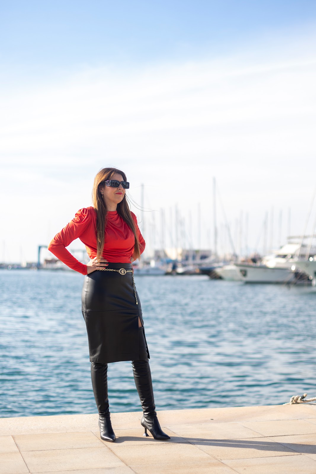 Llevo una camiseta drapeada con hombreras combinada con falda, botas y cinturón de cadena.